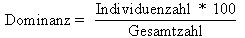 Für jeden Standort wurde die Dominanz errechnet. Es handelt sich hierbei um den prozentualen Anteil der Individuen einer Art an der Gesamtindividuenanzahl. Nach SCHWERDTFEGER 1975 errechnet sich die Individuendominanz nach folgender Formel: